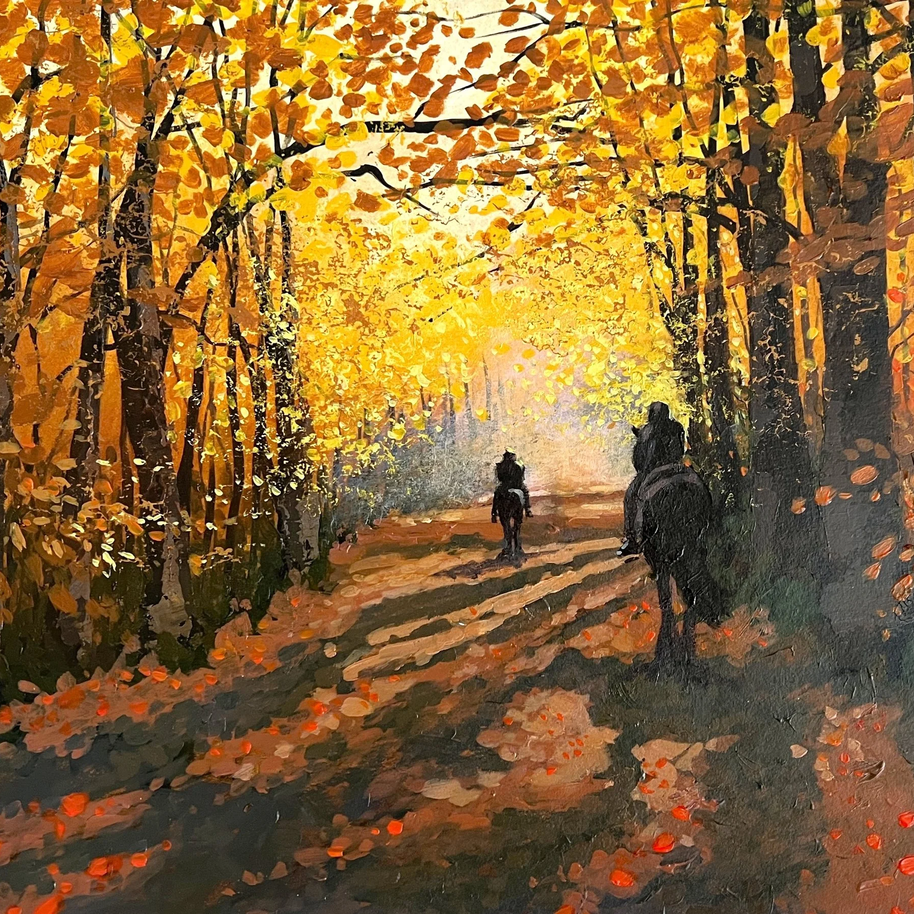 Join me for this step-by-step paint-along course as we explore how to paint an atmospheric autumn woodland scene in acrylics, complete with dappled light, falling leaves, and distant riders moving through the landscape. In this course, we’ll focus on capturing that fleeting autumn moment when golden leaves glow against darker trunks and long shadows stretch across a woodland path. It’s the sort of scene you might glimpse on a quiet country walk and want to hold onto just a little longer.